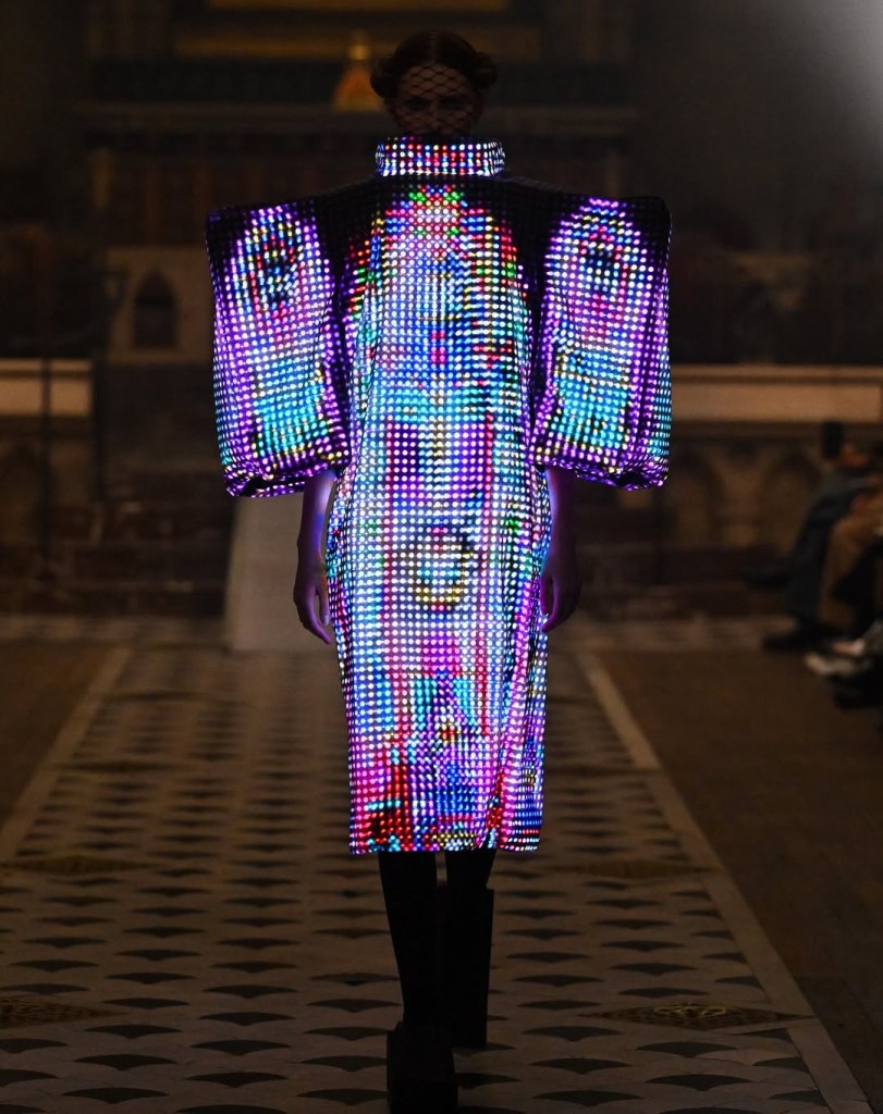Ogni outfit, infatti, era dotato di una batteria e di un sensore che permetteva di manipolarne l’illuminazione dietro le quinte. Un mix di tecnologia e design che ha dato vita a un’esperienza visiva caleidoscopica senza precedenti, perfettamente in linea la nostra era digitale.