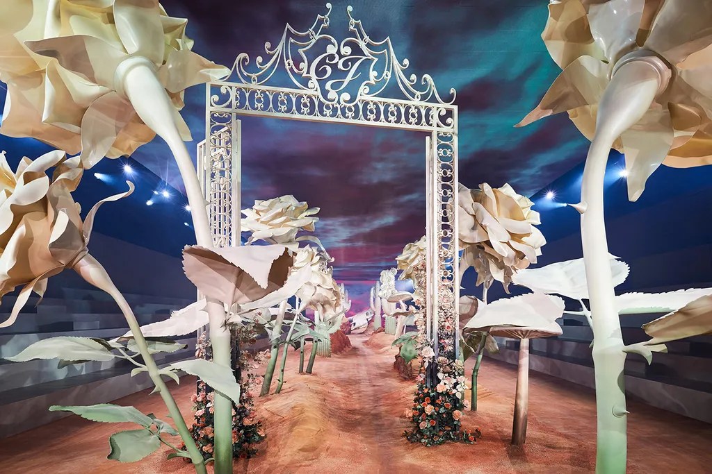 Un altro esempio della visione creativa unica di Es Devlin è la sfilata Dior Primavera/Estate 2022, riproducendo un paesaggio psichedelico. Il set, che combinava l’aridità del paesaggio texano con l’eleganza floreale del marchio, presentava una passerella di 80 metri adornata con rose giganti e cactus, evocando il contrasto tra il deserto e i giardini della tradizione francese. L’allestimento includeva anche archi ornamentali che richiamavano la casa d’infanzia di Christian Dior, mentre le rose in fiore decoravano l’ambiente, creando un’atmosfera unica che univa il patrimonio del marchio con le influenze contemporanee.