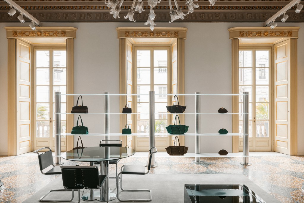 Il cuore pulsante dello spazio è un mobile scultoreo dal design minimalista, arricchito da mensole in vetro sospese che conferiscono l’illusione che le borse fluttuino nell’aria. Questo elemento iconico non solo esalta la leggerezza e l’eleganza delle creazioni di Benedetta Bruzziches, ma le trasforma in vere e proprie opere d’arte, catturando l’attenzione e l’immaginazione di chi le osserva.