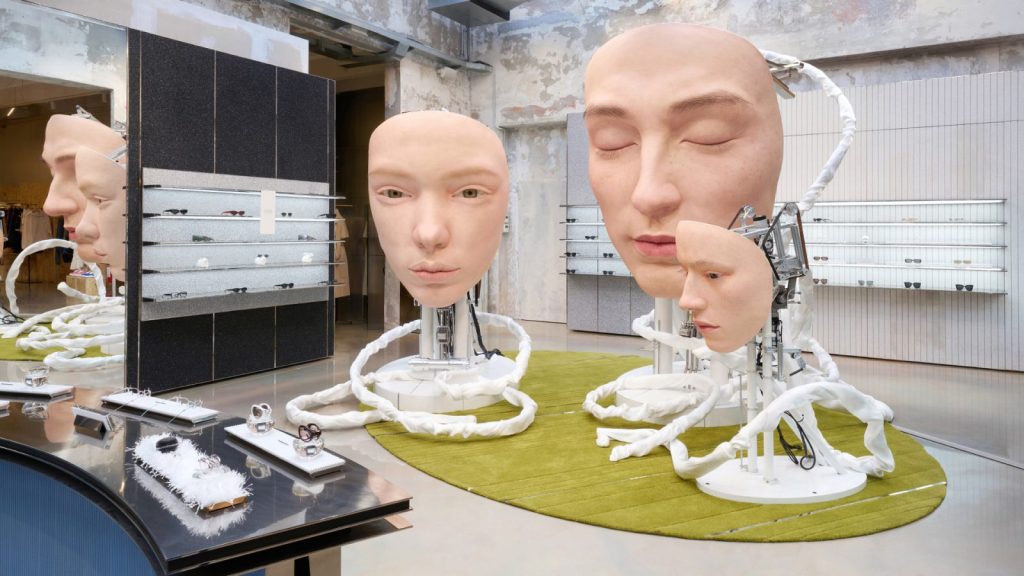 Protagonista del progetto è il GIANT HEAD KINETIC OBJECT, una scultura cinetica sviluppata internamente dal Gentle Monster Robotics Lab. Composto da tre volti distinti, il dispositivo racconta — attraverso movimenti minimi ma carichi di significato — il mistero dei processi interiori. Al centro, un volto chiude lentamente gli occhi e oscilla il capo in un gesto contemplativo; attorno, due volti di dimensioni diverse orbitano con movimenti fluidi, evocando la complessità del pensiero umano.