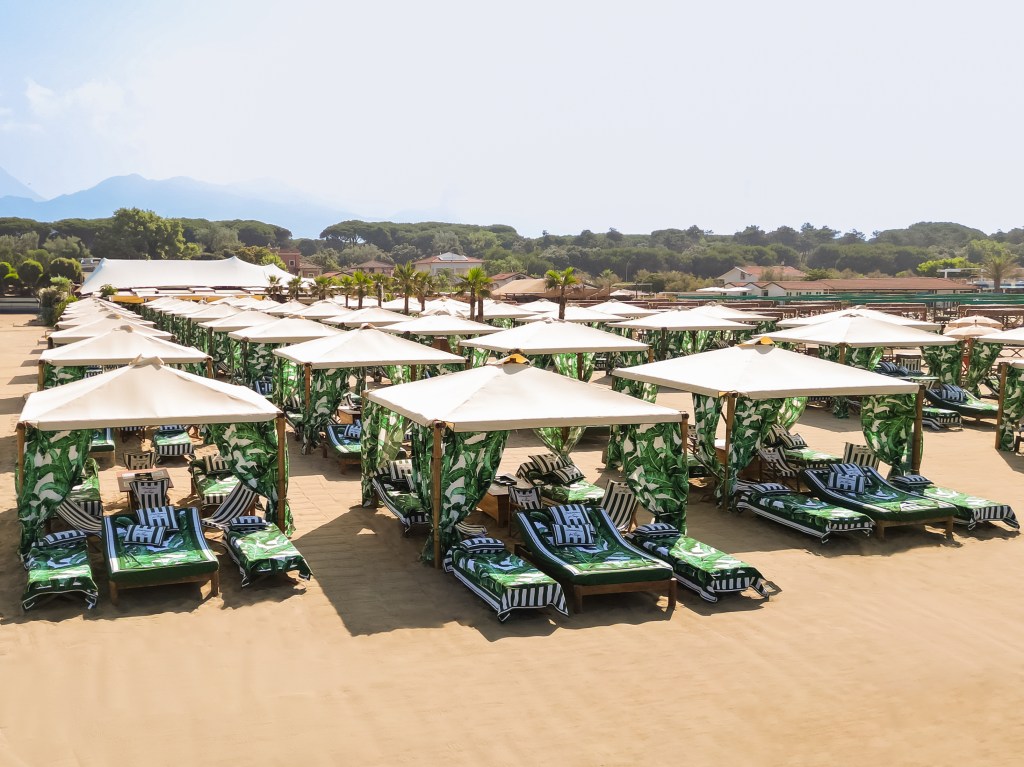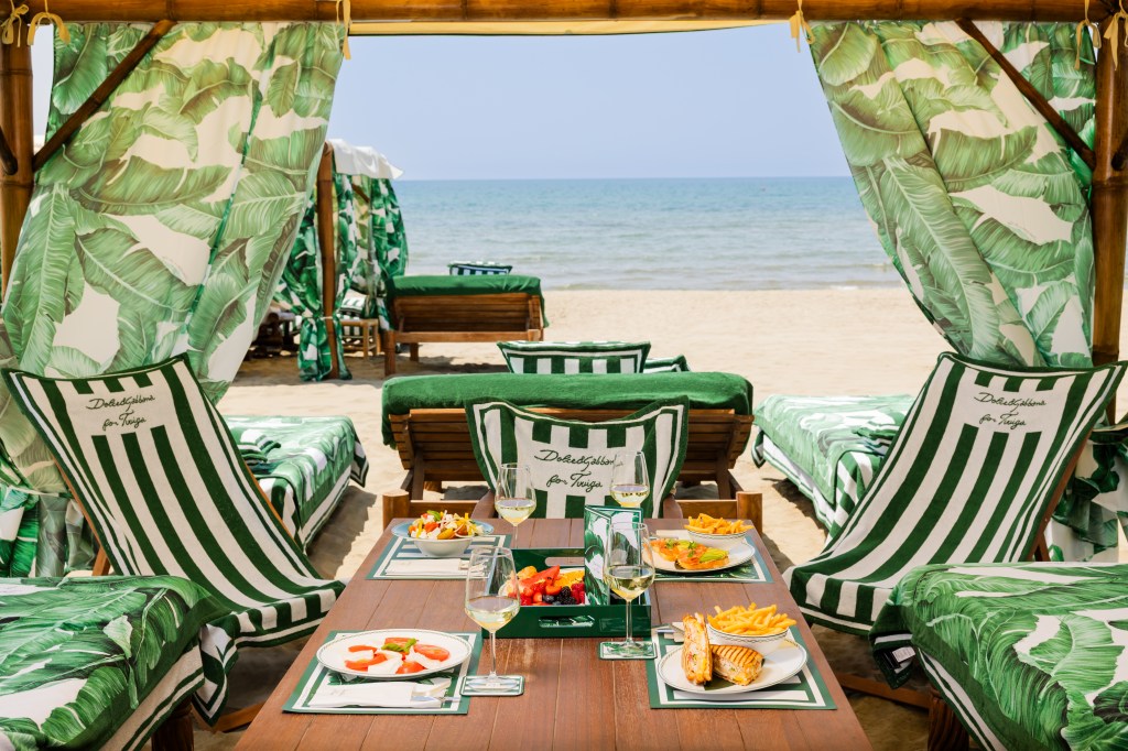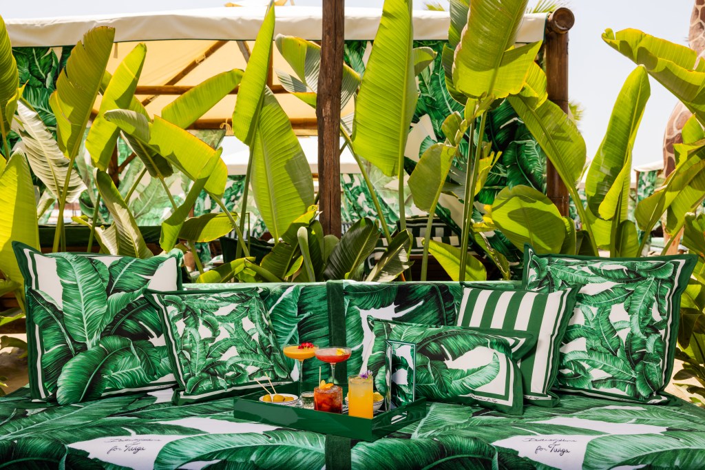 Sullo sfondo scenografico di Forte dei Marmi – con le sue ville storiche immerse tra il profumo dei pini marittimi, le spiagge dorate e il profilo delle Alpi Apuane – prende vita un’inedita esperienza estetica e sensoriale. Il Twiga si presenta oggi in una veste completamente rinnovata, dove natura e design si fondono in un equilibrio vibrante. Protagonista assoluta è la stampa Banano di Dolce&Gabbana, emblema di un’esuberanza tropicale, che riveste l’intera area del beach club: dai lettini alle strutture, fino agli arredi sartoriali, trasformando ogni angolo in un set da sogno.