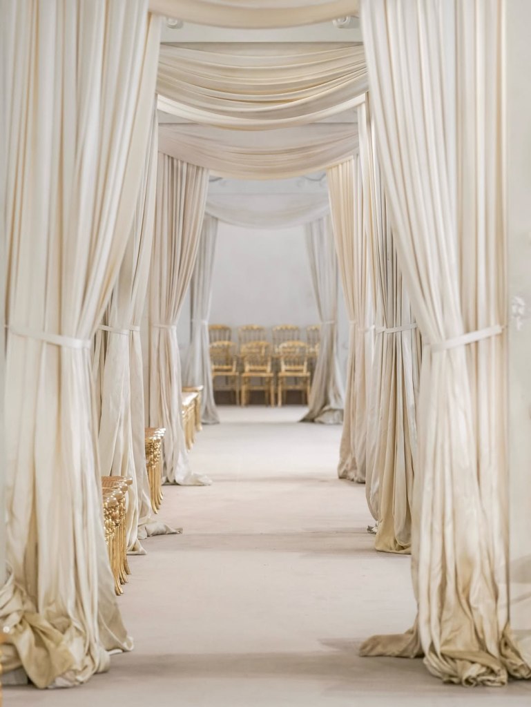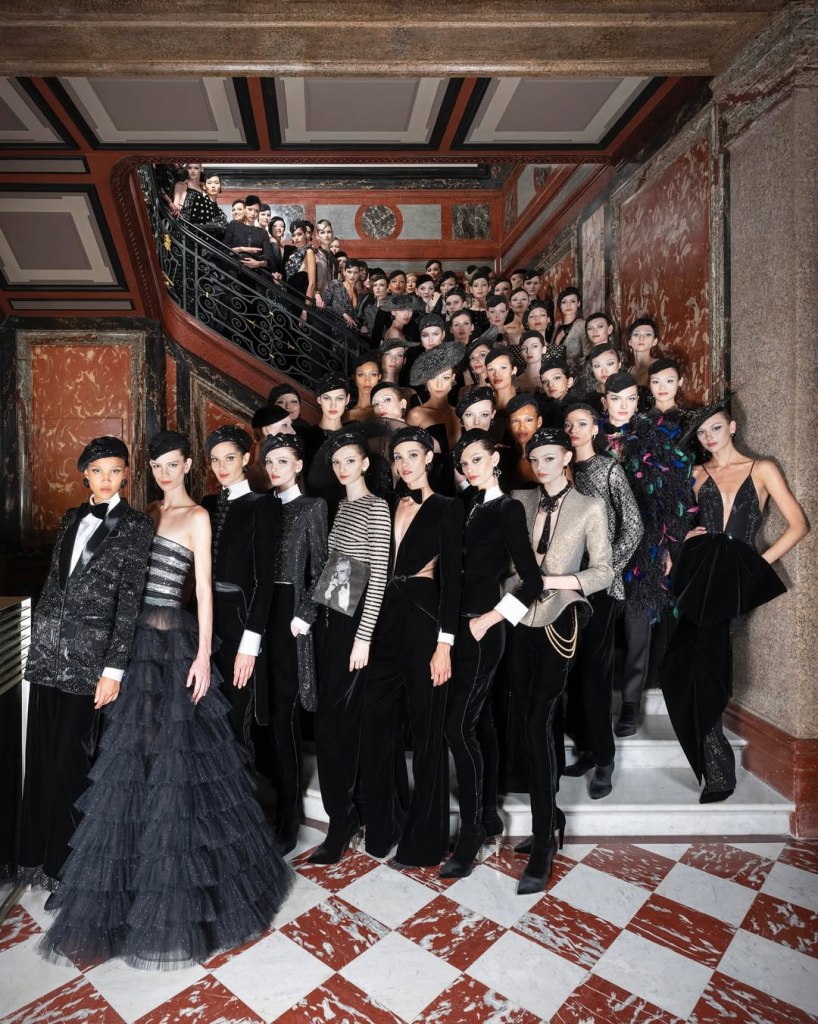Per la sfilata haute couture, tenutasi l’8 luglio, la passerella, madreperlata e luminosa, si snodava tra saloni neoclassici, offrendo un perfetto equilibrio tra rigore moderno e opulenza aristocratica. Un’architettura che diventa dichiarazione di stile.