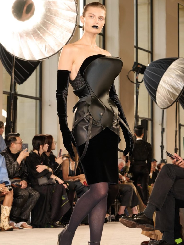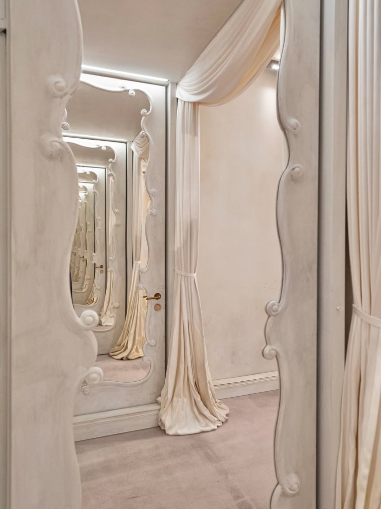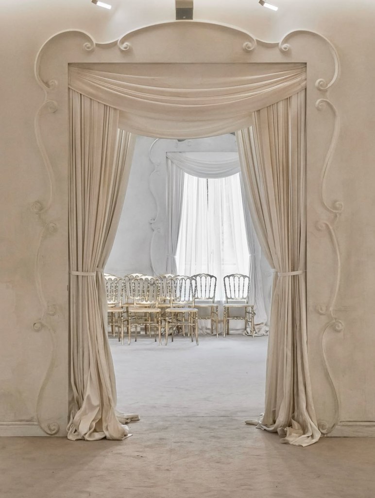 Stanze intime, pareti avorio, tende pesanti e luci diffuse hanno restituito la dimensione originale dell’haute couture: artigianalità, silenzio e forma. Nessun artificio, solo silhouette scultoree in un contesto autentico, quasi monastico.