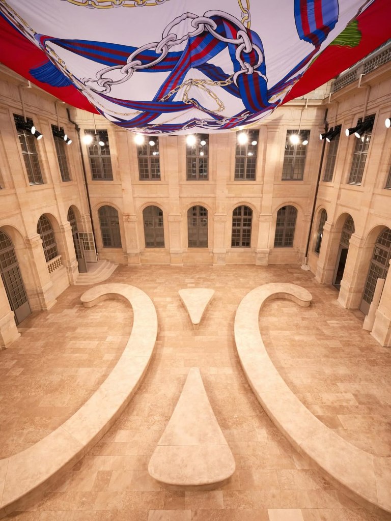 Il 6 luglio ha segnato il debutto di Michael Rider alla guida creativa di Celine. La location scelta per la collezione primavera/estate 2026 al 16 di rue Vivienne, è l’headquarter di Celine. Pochi elementi scenografici; all’interno della corte principale sedute in finta arenaria intagliata richiamano il logo della maison e un enorme foulard di seta funge da copertura effimera. Una scelta architettonica chiara: l’ambiente stesso diventa dichiarazione d’intenti, facendo da sfondo silenzioso a una nuova visione stilistica.