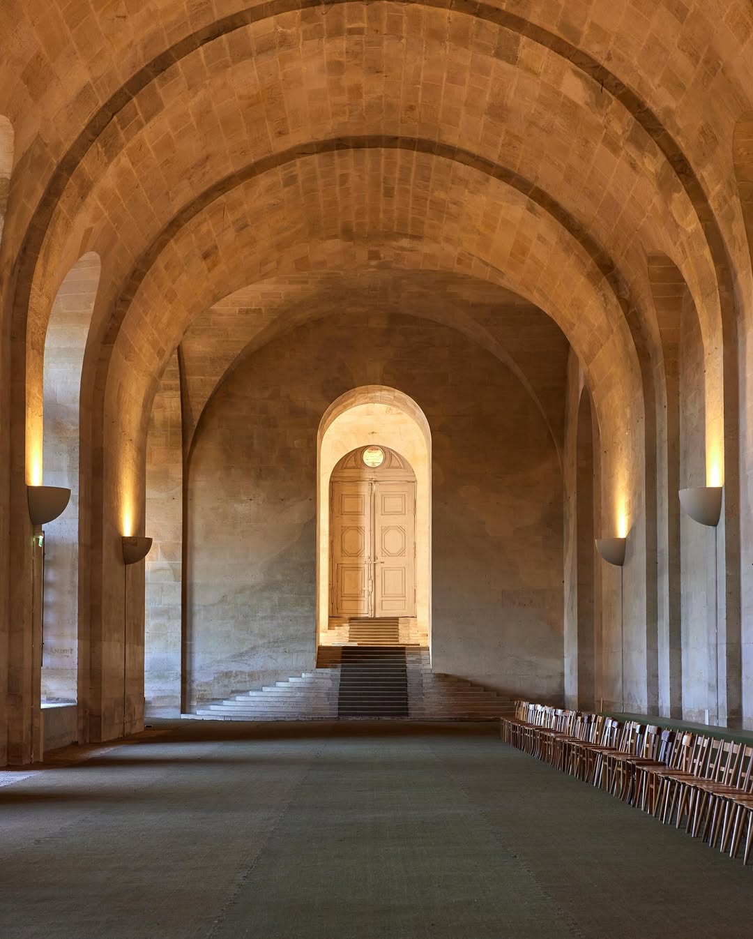 Moquette chiara, tende beige che rivestono le pareti e un’acustica ovattata restituiscono un senso di intimità discreta. Nel cuore del Salon d’Honneur del Grand Palais, gli ospiti prendevano posto su ampi divani in tonalità écru