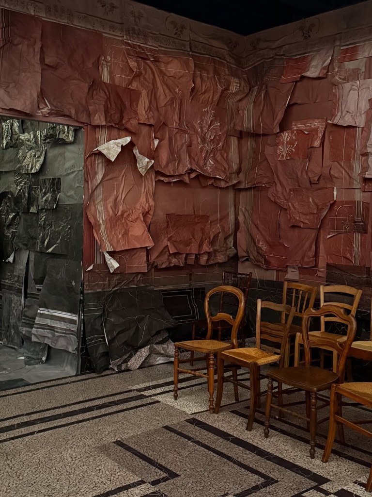 Le superfici scheggiate, i drappeggi di tessuti che si scompongono e gli elementi decorativi deteriorati hanno creato un’atmosfera in cui la bellezza della decadenza diventava il cuore pulsante della collezione. L’intera ambientazione era un’allegoria della fragilità della bellezza, proprio come le creazioni di Margiela, che giocano con la disintegrazione dei concetti tradizionali di eleganza e perfezione.