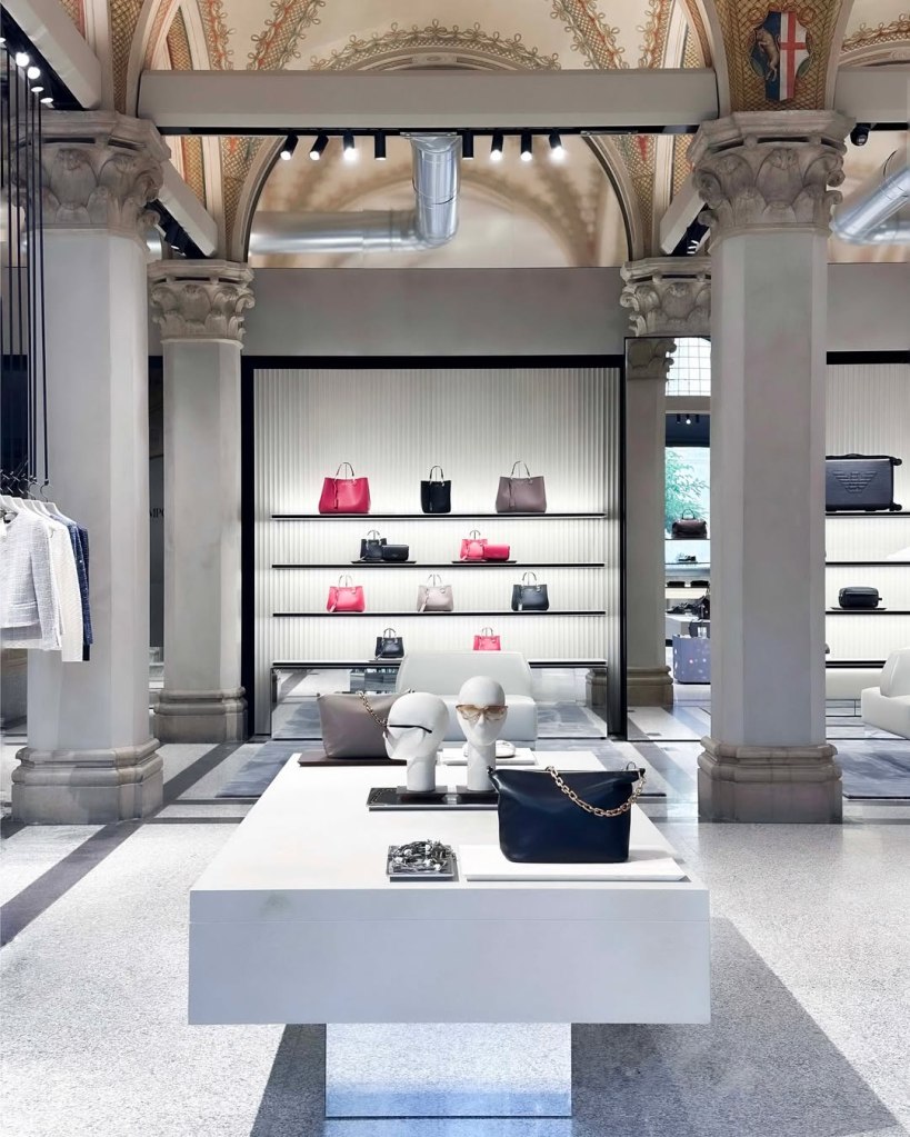 Lo store, gestito in collaborazione con Tessabit, si sviluppa su una superficie di 250 metri quadrati. Ospita le collezioni uomo e donna di Emporio Armani, affiancate da accessori, eyewear, orologi e gioielli. Gli interni, concepiti secondo il concept architettonico già sperimentato nella boutique di via Manzoni a Milano, si distinguono per arredi modulari, sedute dalle linee essenziali, specchi sospesi e pavimentazioni in seminato originale. Le ampie vetrine ad arco aprono il dialogo con la piazza, invitando il passante a soffermarsi in uno spazio che comunica attraverso il silenzio della misura.