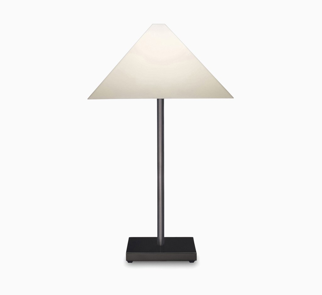 Disegnata nel 1982 per uso personale, la lampada fu il primo elemento d’arredo concepito da Armani e, molti anni più tardi, divenne il simbolo stesso di Armani/Casa. La sua struttura in metallo satinato sostiene un paralume a tronco di piramide in metacrilato avorio: un equilibrio di linee essenziali, una purezza formale che si fa memoria collettiva. È l’archetipo della lampada da tavolo, quella che tutti inconsciamente immaginiamo: lo stelo verticale, la geometria perfetta del paralume, la chiarezza assoluta delle proporzioni.