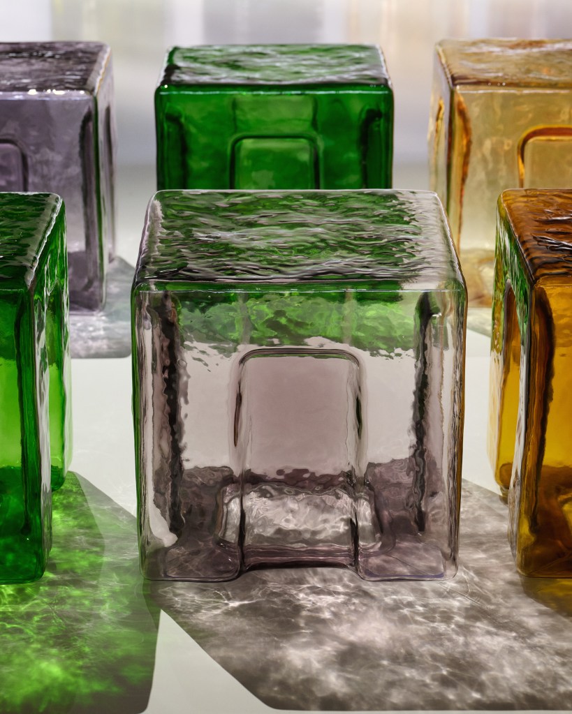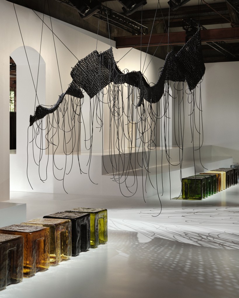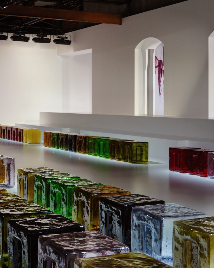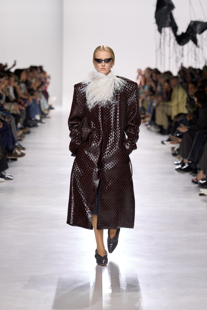 Il set della sfilata, allestito in un’ex fabbrica milanese, traduce questa visione in uno spazio che unisce memoria industriale e sensibilità contemporanea. Sedute in vetro colorato di Murano e sculture in crochet punteggiano la passerella, creando un dialogo armonico tra tradizione artigianale e estetica moderna. Le installazioni sospese, in particolare, diventano richiami diretti alla rivoluzionaria soft functionality dell’Intrecciato, la tecnica sviluppata dal cofondatore Renzo Zengiaro e oggi simbolo della maison: nel set-design trova la sua declinazione più concettuale, mentre in passerella prende forma concreta in abiti e accessori, dalle proposte quotidiane alle creazioni più sofisticate.