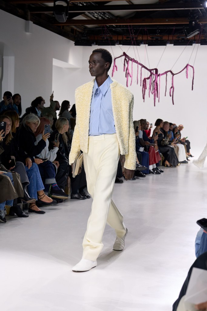 La collezione stessa si muove tra rigore e libertà: la sartorialità maschile italiana diventa matrice comune per capi femminili e maschili, con tessuti leggeri, trench in nappa e abiti da sera strutturati ma fluidi. Le borse, da sempre emblema del marchio, raccontano un percorso di stratificazione e reinvenzione: modelli storici come la Lauren, la Knot e la Cabat vengono reinterpretati accanto a nuove creazioni come la Squash, la Framed Tote e la Crafty Basket, dimostrazioni di una maestria artigianale che non smette di innovarsi.