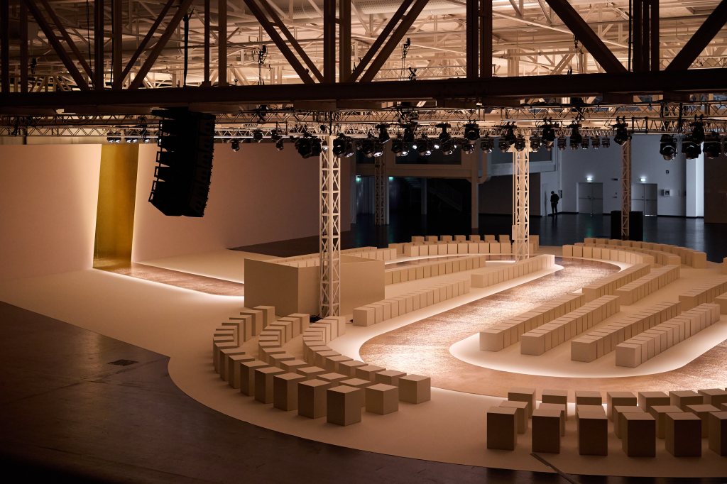 Ma è la scenografia a trasformare il défilé in un’esperienza immersiva: una passerella dorata che si irradia come un fiume di luce, attraversando lo spazio industriale reso etereo da strutture metalliche e giochi di proiezioni. La sala, scandita da sedute monolitiche color avorio, si presenta come un tempio contemporaneo, essenziale e solenne, dove il bagliore dell’oro diventa protagonista assoluto. L’architettura, spogliata di orpelli, si fa cornice silenziosa e potente: un palcoscenico che esalta il dialogo tra moda e spazio, materia e luce.
