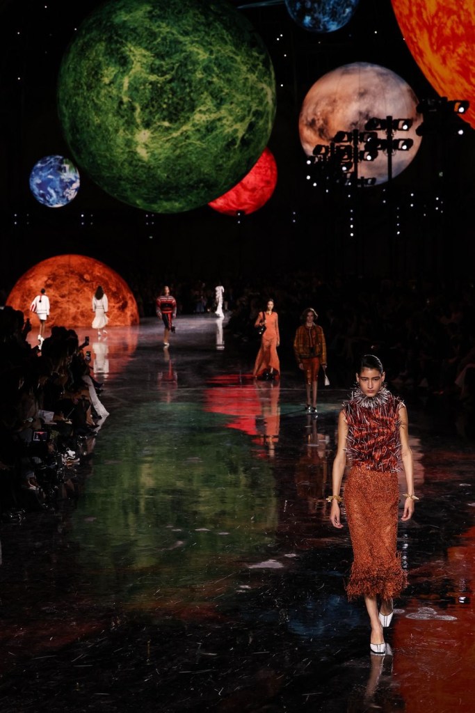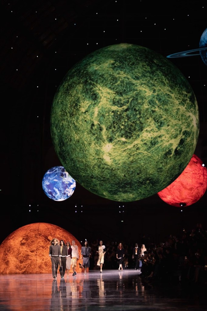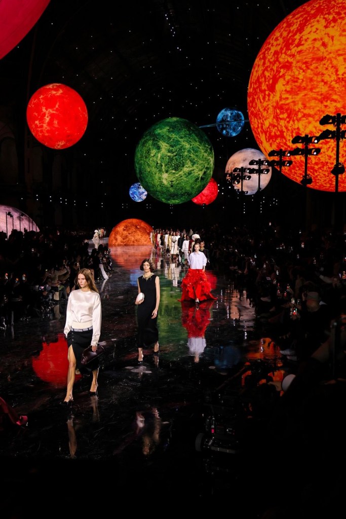 Il Grand Palais — una location che Chanel ha utilizzato svariate volte negli ultimi decenni, trasformandolo in spiaggia, giardino, stazione ferroviaria e persino base spaziale — si presenta ora come un vuoto siderale, ridisegnato da un sistema di pianeti fluttuanti di varia grandezza (da uno centrale di circa 15 metri a piccole sfere satelliti).