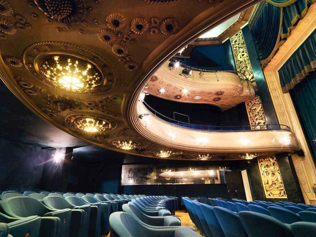 La facciata, un’interpretazione personale dello stile Impero, è un manifesto di eleganza e rigore: tre campate centrali incorniciate da due laterali, una cornice a modiglioni sorretta da sfingi in pietra e mascheroni che punteggiano la superficie spoglia. All’interno, Bluysen orchestrò gli spazi con sapienza scenica: un seminterrato liberato per l’orchestra, palchi laterali aperti e un fondo sala riservato da schermi lignei. Un piccolo fumoir-bar completava l’ambiente, regalando all’intervallo un tono raccolto e mondano.