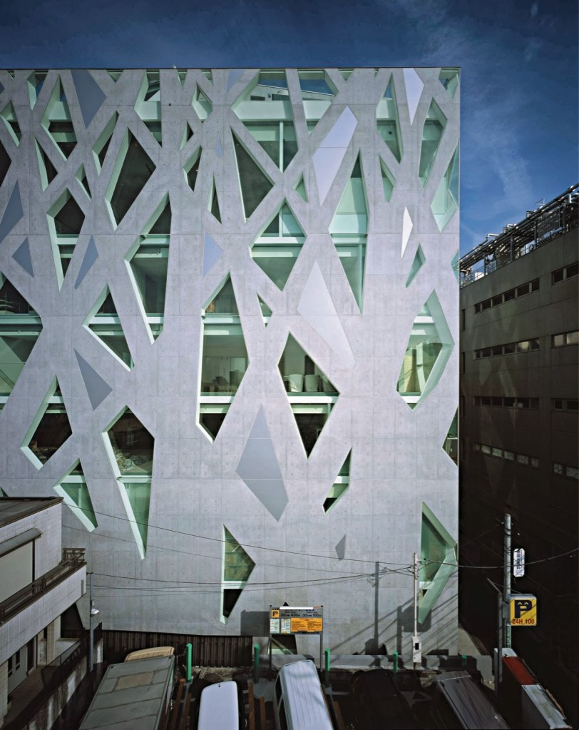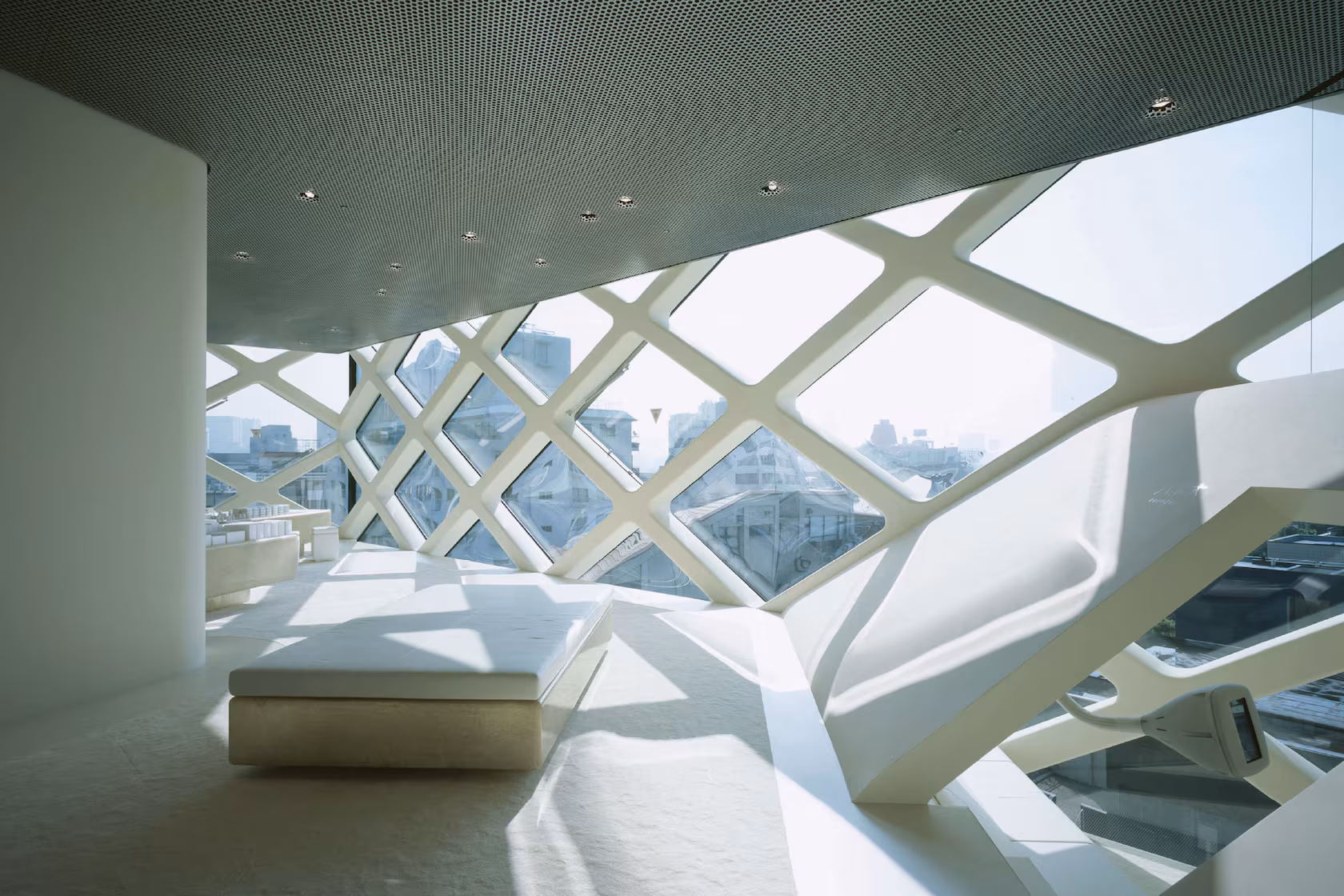 Poco distante, Prada affida ancora a Herzog & de Meuron il suo celebre Epicenter di Tokyo, un edificio che ridefinisce il concetto stesso di facciata. Il volume di vetro verde, scandito da una griglia diagonale, si apre come un cristallo tagliato, ospitando boutique, lounge e spazi espositivi. Qui struttura, spazio e pelle coincidono: ogni elemento visibile — trave, nucleo o lastra — è parte integrante dell’architettura. L’edificio diventa così un organismo poroso, un’icona di trasparenza e leggerezza nel cuore di Aoyama.