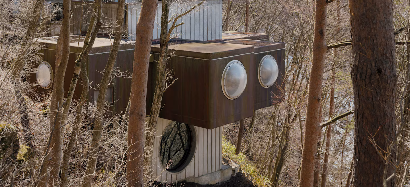Da qui si vola idealmente fino a Nagano, in Giappone, dove sorge la Capsule House K di Kisho Kurokawa, uno dei rari esempi ancora esistenti del Metabolismo. Le sue capsule cilindriche, autonome e impilabili, immaginate come prototipi di vita modulare e sostenibile, ricordano una città futurista racchiusa in un bosco. La valigia di RIMOWA, posta negli spazi essenziali dell’abitazione, sembra quasi rafforzare l’idea di movimento, di adattabilità, di una vita dinamica che si ricompone di volta in volta.