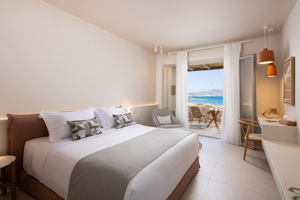 Le diciotto suite del resort, elegantemente progettate, offrono viste spettacolari sull’Egeo e sull’entroterra. Ogni tipologia di suite è concepita per rispondere a differenti esigenze: dalla romantica Sunset Breeze alle eleganti Sunrise Escape, dalle Cerulean Bliss pensate per famiglie o piccoli gruppi alla lussuosa Aqua Horizon Private Pool Suite con piscina privata e terrazze panoramiche. Tutte privilegiano la luce naturale, il comfort e il contatto con la natura, regalando la sensazione di vivere sospesi tra cielo e mare.