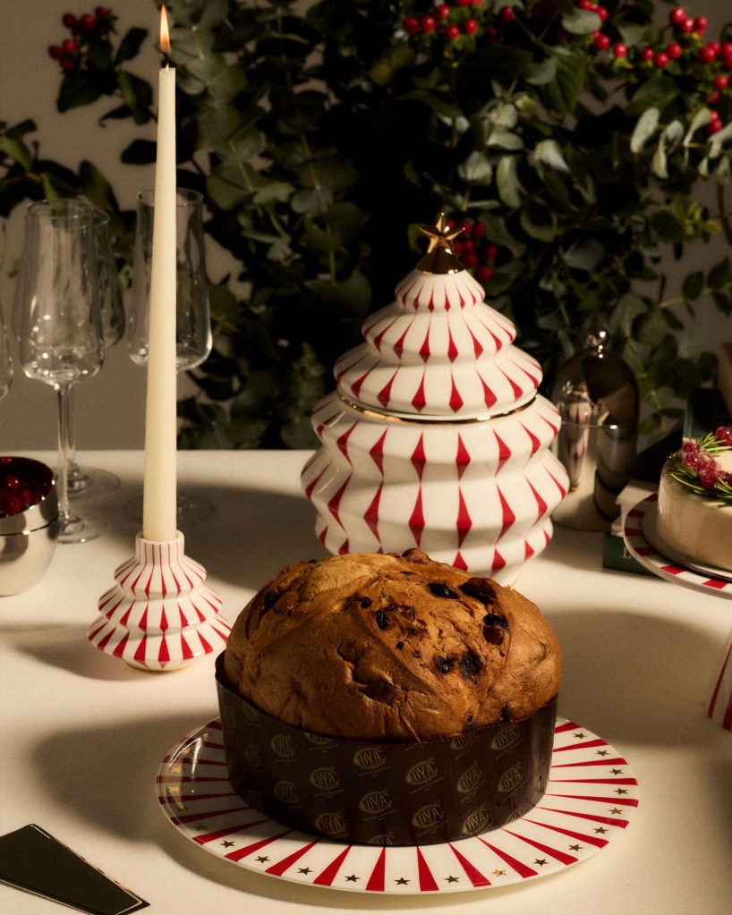 È impossibile non iniziare da Fornasetti, atelier nato nella Milano fervida del secondo dopoguerra come espressione diretta dell’estro inesauribile di Piero Fornasetti. Artista, designer, visionario, Fornasetti è stato una delle figure più prolifiche del Novecento italiano, capace di costruire un universo visivo coerente e sorprendente. Porcellane preziose, mobili raffinati e complementi d’arredo costituiscono il cuore di una produzione che si muove con naturalezza tra arte e design. Oggetti da contemplare e da utilizzare, capaci di trasformare la quotidianità in esperienza estetica. Ed è proprio da qui che prende avvio la nostra selezione: panettoni al latte impreziositi da grafiche riconoscibili (135€) , candele profumate (150€), set di porcellane da tè (500€) e piccoli portaoggetti decorati con volti felini (75€), irresistibili per gli amanti dei gatti e del design illustrato.
