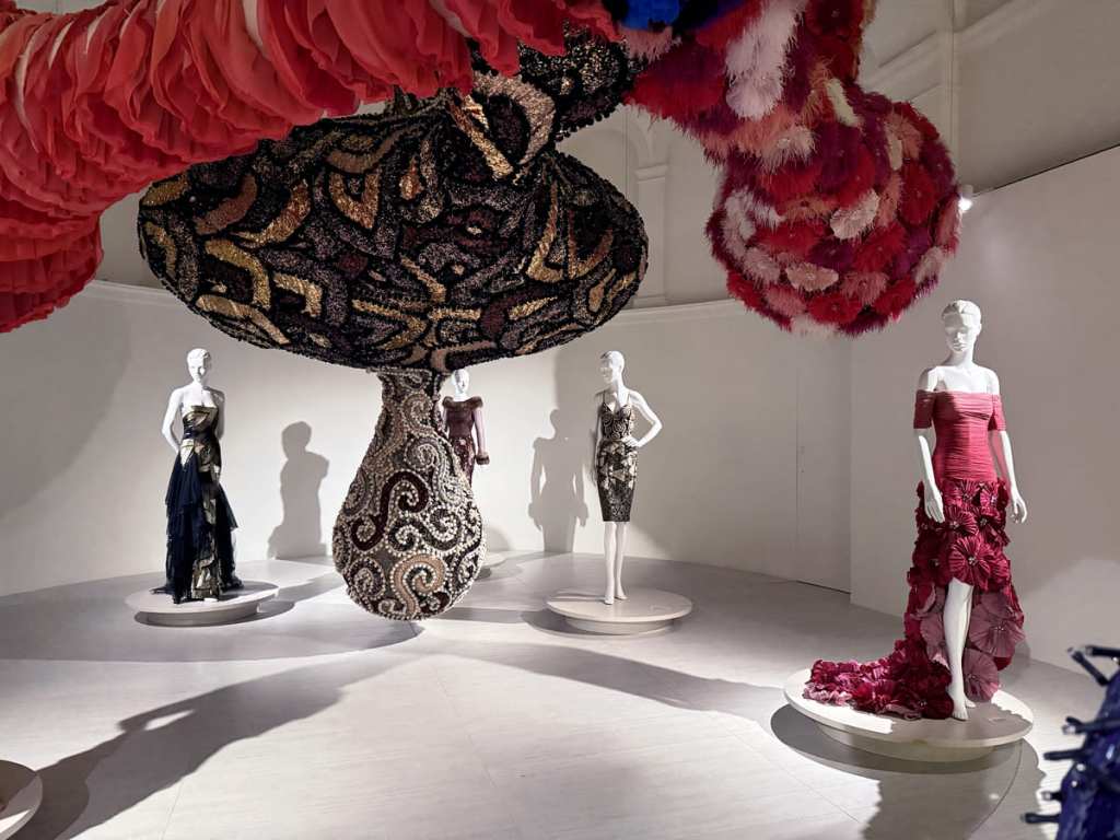 Al cuore della mostra si trova la Valchiria VENUS, opera monumentale concepita appositamente per PM23, che si estende nello spazio come sintesi tra i capi storici di Valentino e le interpretazioni contemporanee dell’artista. Le sale successive ospitano installazioni emblematiche come i Crochet Paintings e opere che affrontano resilienza, metamorfosi e stereotipi legati alla cultura patriarcale, accostate a creazioni di Alta Moda di diverse stagioni. Il percorso continua con la sala tematica Marilyn e culmina nel Garden of Eden, dove otto abiti total black realizzati con tessuti preziosi e lavorazioni complesse creano un racconto mitico condiviso, in cui moda e arte si fondono in un dialogo organico e suggestivo.