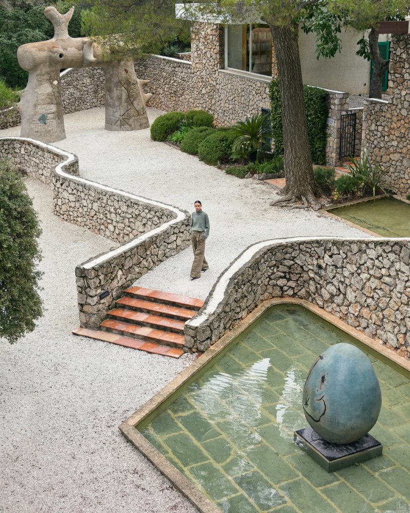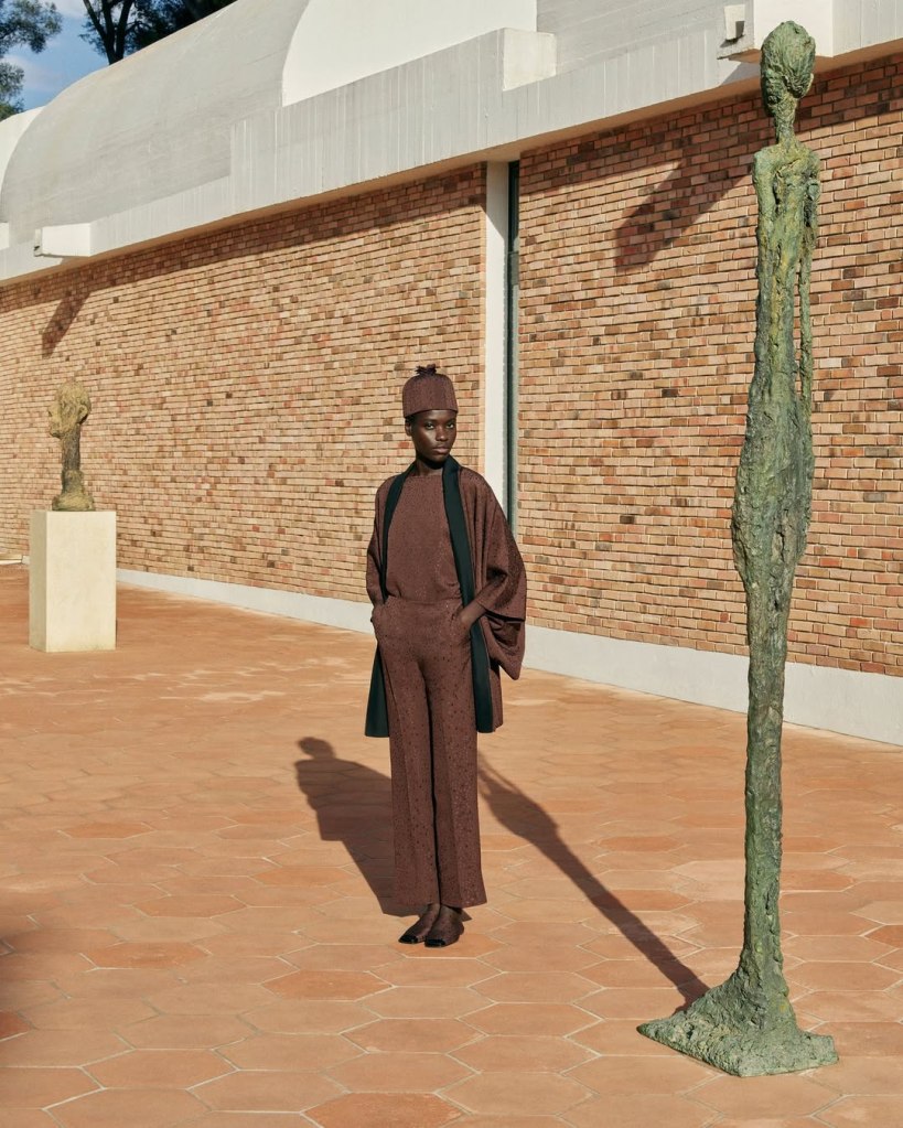 Gli abiti non occupano lo spazio: lo abitano. Dialogano con le opere, con le superfici, con l’architettura. In uno scatto emerge un affresco di Marc Chagall, in un altro le silhouette filiformi di Alberto Giacometti; altrove, il percorso visionario del Labirinto di Joan Miró diventa scenografia viva. Persino gli spazi raccolti della biblioteca privata entrano nella narrazione visiva, suggerendo un’intimità colta, lontana dall’ostentazione.