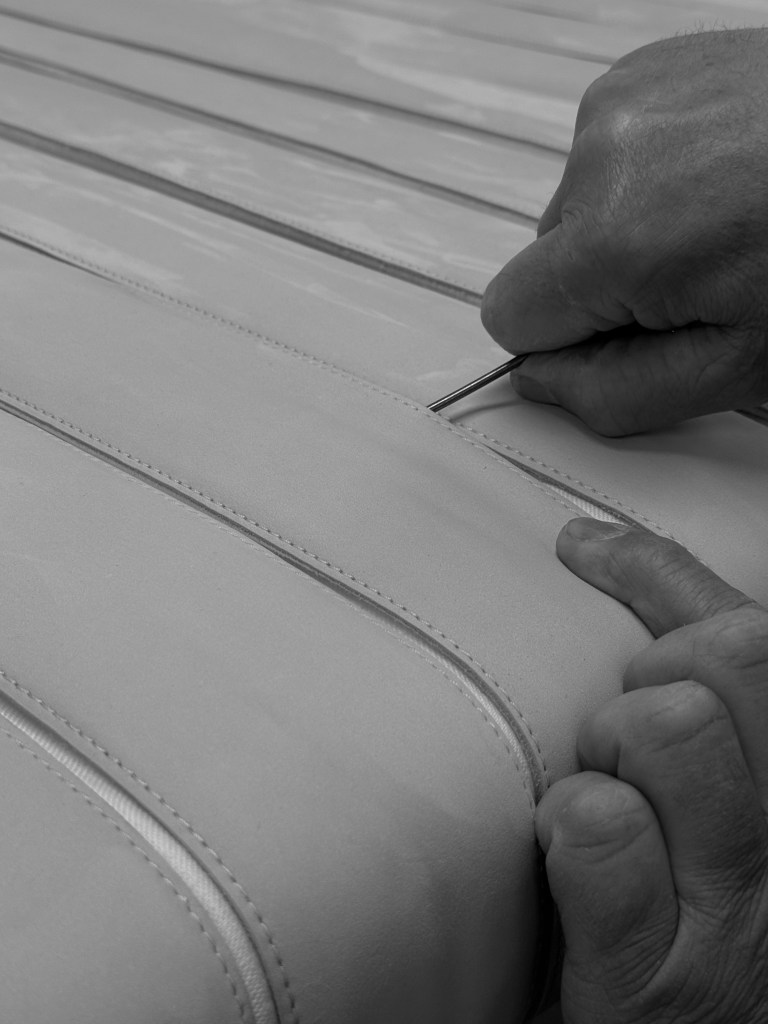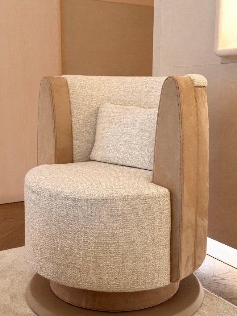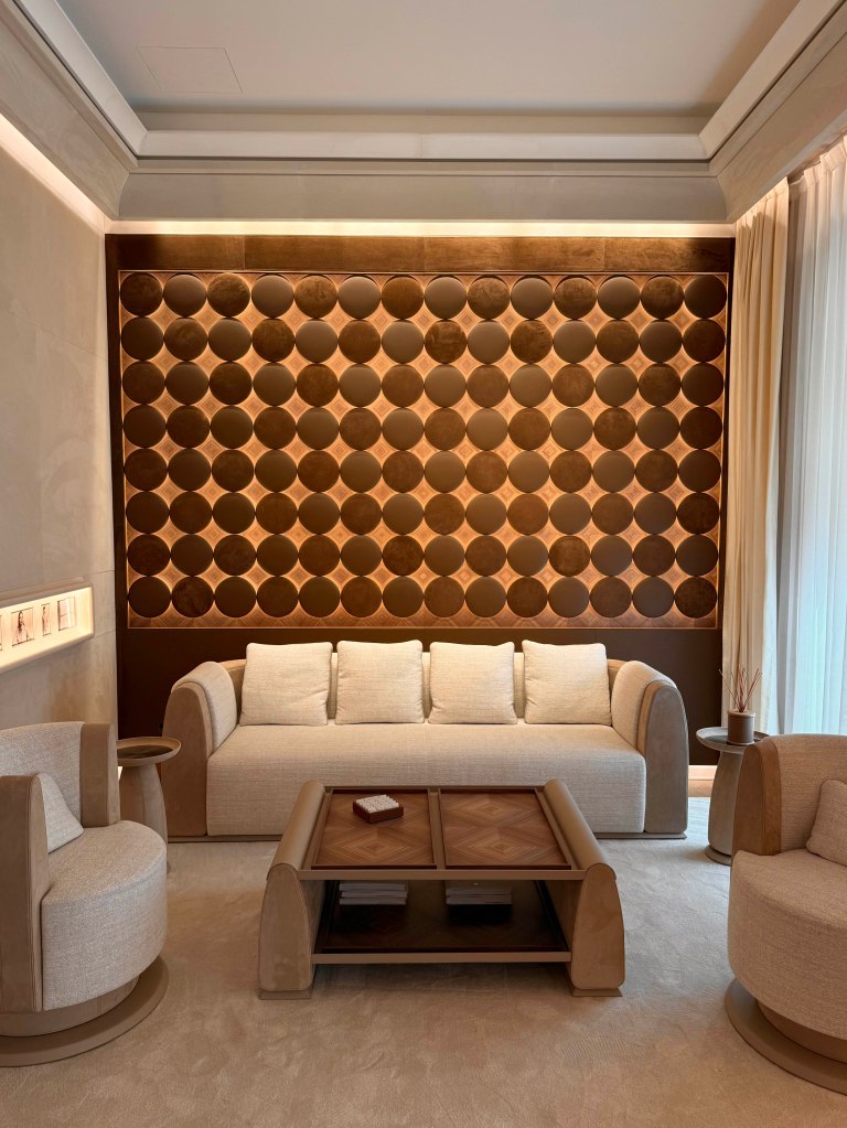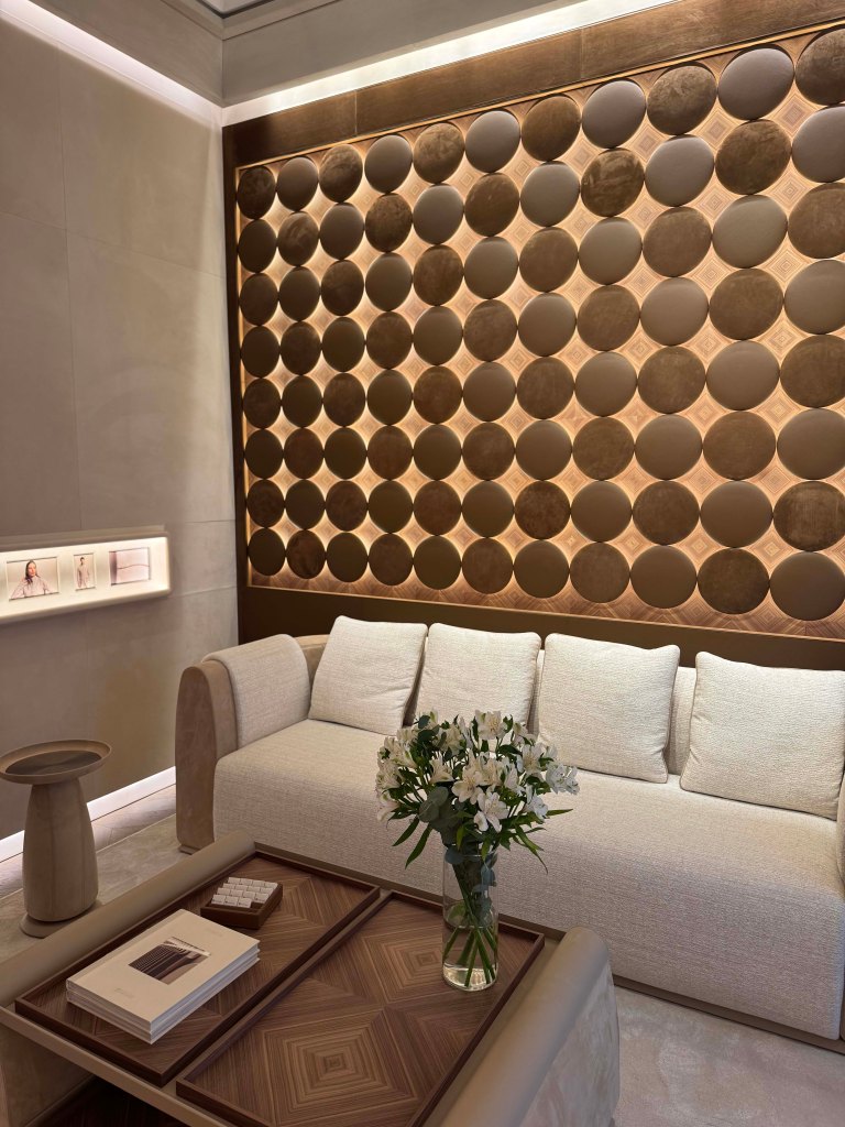 Fondata nel 2006 a Mariano Comense, nel cuore della Brianza manifatturiera, l’azienda si è distinta per una visione precisa: trasformare il sapere artigianale italiano in un linguaggio contemporaneo, capace di dialogare con i mercati internazionali più esigenti. In occasione della Milano Design Week, Ludovica Mascheroni presenta due creazioni esclusive pensate per sintetizzare la propria filosofia progettuale. Una boiserie artistica, realizzata con le iconiche pelli e le essenze lignee più pregiate, interpreta la parete come elemento narrativo e decorativo. Accanto, un sofà ispirato ai disegni d’archivio viene riletto in chiave contemporanea, dimostrando la capacità del brand di innovare senza perdere il legame con le proprie radici.