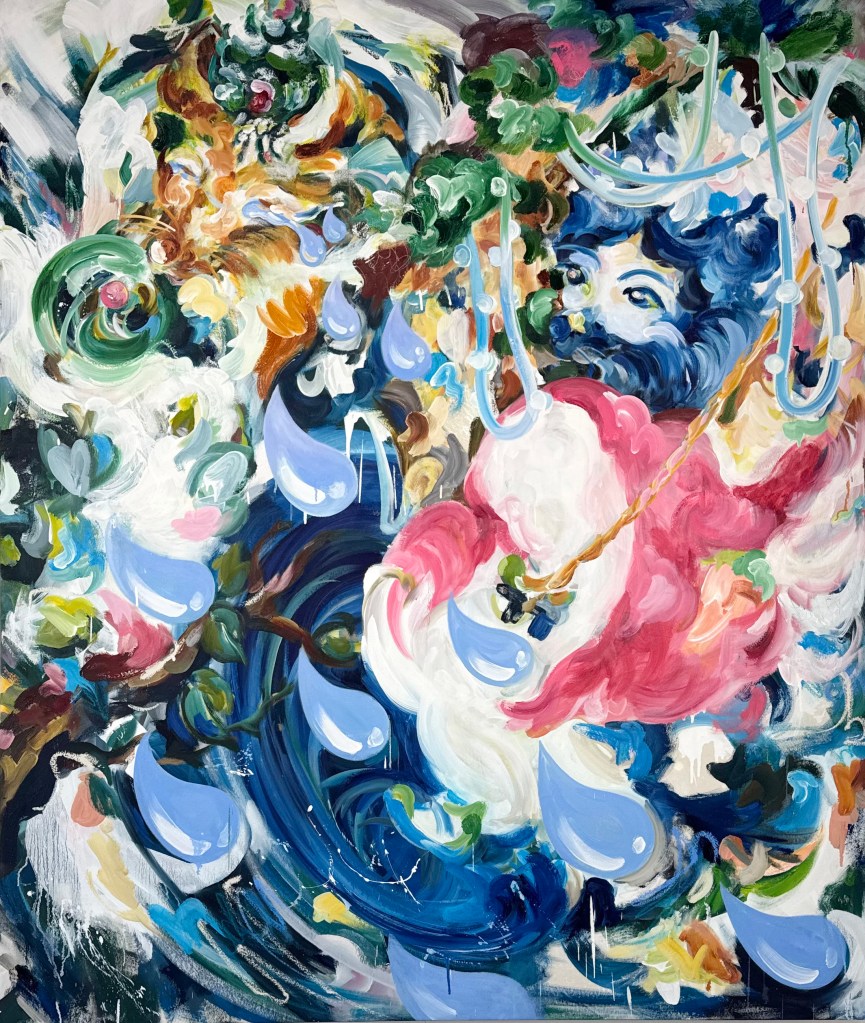 K Blick rilegge questa tensione come metafora universale del desiderio di metamorfosi e presenta 16 opere (10 dipinti, 1 opera su carta e 5 lavori in ceramica portoghese) in dialogo con gli spazi della galleria, che si trasforma in un paesaggio simbolico e sensoriale tra mito, natura e identità. Diversi elementi – ad esempio un’altalena, simbolo di libertà e della natura femminile della volpe che si trasforma in donna, accompagnata dalle lacrime dell’animale versate a terra – si affiancano infatti alle opere per restituire al pubblico un luogo immersivo dove la narrazione della leggenda si rinnova e rovescia: e se la volpe non volesse diventare umana?
